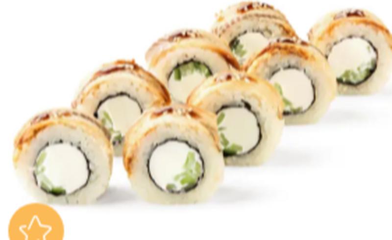 Состав: Угорь, сливочный сыр, огурец, соус унаги, кунжут. Соевый соус не входит в комплект к блюду