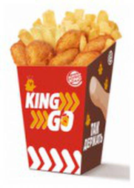 Состав: Наггетсы, сделанные из нежного белого куриного мяса в легкой хрустящей панировке, и золотистые и хрустящие ломтики горячего и свежего картофеля Кинг Фри отлично дополняют друг друга.